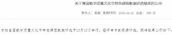 近日,学校质量管理与评价处公布了《关于首届教学质量文化节特色课程教案评选结果的公示》,欧美色情